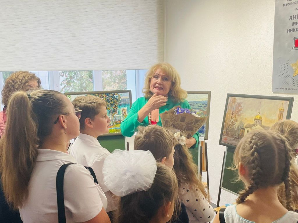 Е.А. Полтавская рассказывает гимназистам о селе Васильевка, где прошёл один из пленэров